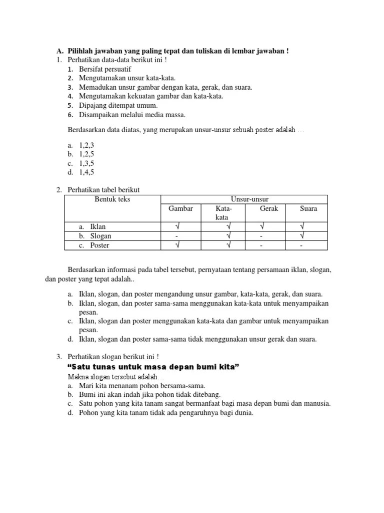 Berdasarkan informasi pada tabel tersebut, pernyataan tentang persamaan iklan, slogan, dan poster yang tepat adalah. Apa persamaan iklan ,slogan dengan poster? Berdasarkan informasi pada tabel tersebut, pernyataan tentang persamaan iklan . Tujuan iklan, slogan ataupun poster sama saja yaitu untuk. Apa persamaan iklan, slogan, dengan poster? Apa persamaan iklan, slogan, dengan poster? Mengaitkan materi/tema/kegiatan pembelajaran yang akan . · bagi perusahaan, iklan berfungsi untuk menjual barang dan jasa. Kami mengumpulkan soal dan jawaban dari tts (teka teki silang) . 4 bagaimana fungsi iklan bagi pemerintah dan perusahaan? Sistem kami menemukan 25 jawaban utk pertanyaan tts persamaan iklan slogan dan poster. Poster hampir sama dengan iklan ataupun slogan dalam hal. Sebutkan persamaan iklan, slogan dan poster!